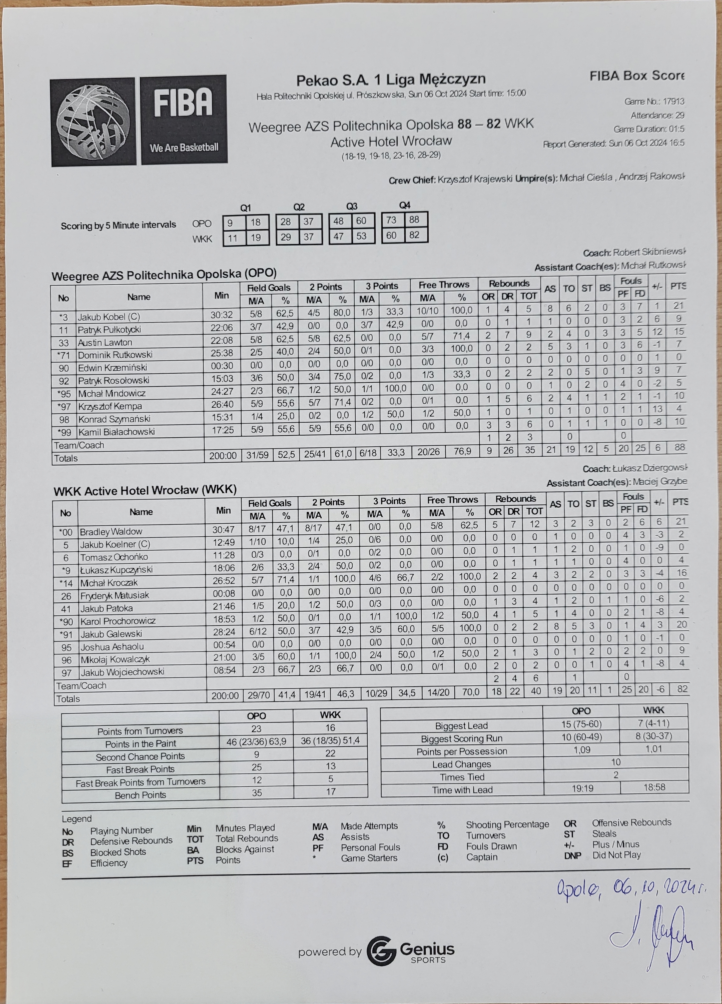 | 4 | 06:27:00 | 10 | 91, J. Galewski, celny rzut wolny 1z2 | |